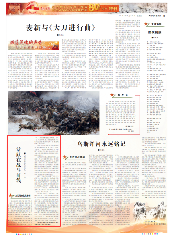 活跃于战斗的前线,教授文化和娱乐活动的深层公司也是一项非常重要的任务。我们与士兵一起游行,教他们唱歌,有时我们不得不进行军事扩张并完成军事任务,例如收集军事口粮。部队曾经传播以进行战斗活动,宣传团队派人加入团队参加战斗。我们向敌人大喊,救出了受伤的人,带炮弹,做了我们被分配的一切,并总是在战斗的前线中活跃。为了收集军事和草的口粮,我们经常与我们的村民一起提供食物。当您遇到一个说唱同伴时,您将为您唱一些Shanxi Bangzi的部分。当您遇到一个年轻人时,Tutwe告诉她唱新歌。我们团结一致。为了释放该国,村民们付出了一切,基地地区的亲戚正在努力工作,做出巨大的贡献!参加该团战争的同伴只有返回。在他们有时间休息之前,敌人的“席卷”再次开始。这是更残酷的“十月席卷”。我记得在Xijing的表现结束之前,敌人大量攻击了基本区域。我们整夜搬进了深山。前一天晚上,当我们逃离Xijing镇时,它仍然是一个独特而繁荣的村庄。但是在战斗结束时,当我们下山然后到达Xijing时,它被压碎了。村民点点头,看着亲戚的尸体,悄悄地哭了。乳房的愤怒燃烧和仇恨加速了我们的发展速度!李维(Li Wei)同志的“空房间里的Qingye”是通过目睹这种情况而写的。这首歌不是出版,而是在我们对群众耐心并很快散布到群众时,口头教给我们。张河的干河被各种尺寸的岩石覆盖。这是道路,唯一的道路,前进的道路。人们的钢铁脚和动物脚踩在岩石上,发出声音。下雨了,似乎上帝已经移动了它,想用他的水晶眼泪洗净世界上的不公正现象。雨变得越来越大,而且有广阔的起义。我们在敌人身上扮演捉迷藏。敌人在山的脚下,所以我们爬上了山。当敌人爬上山时,我们去了山上。那天晚上,在Zuohui山上大雨。每个人都安静地坐在山顶,哨兵监视了敌人的运动。在这个漆黑的夜晚,坐在风和雨的山上,人们怎么看?没有悲观,没有挫败感,我只想击败敌人并克服所有的困难和苦难。人们小声说:“我们的副总司令彭在不远的山上!”有人说:“现在不要看,我会回到这里成功之后。“是的,在释放后,一些同志们真的回来了,看到了令人难忘的风和雪山。但是,在战斗中,有些同志被埋葬在塔里山上。我们的老师和陈·云吉(Chen Yunji)一起住在农场,死在1942年的“抗击”行动中。