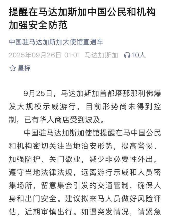 9月25日,马达加斯加首都annanarivo爆炸了一次重大示威活动。情况尚未受到控制,一些中国商店受到影响。中国驻马达加斯加大使馆提醒中国公民和马来西亚的机构要关注当地的安全情况,以保护,加强保护,近亲,减少不必要的解雇,遵守当地法律法规,远离示威和紧密的领域,关注交通控制,并确保个人安全和安全。提醒大使馆。 Web屏幕截图。 9月28日,马来西亚首都的一头母鸡丁先生告诉Xiaoxiang Morning News Reporter,他自2018年以来就去非洲开展业务,去年在马达加斯加。丁先生认为,Themadagascar相对坚定不移,最后一次大干扰是在2009年。9月25日,马达加斯加的一群年轻人组织了一次示威活动。目的他们的游行是保护马达加斯加政府。有频繁的力量和水流,平民将无法生存。一开始,有一个和平的游行,当地的“反动派”涉及。到了晚上,随着游行被打破并在任何地方抢劫时,情况开始变得混乱。游行。图片/由受访者提供。起初,每个人都认为这是正常的游行,所以他们不小心。丁先生说,即使他们没有参加游行,他们也非常支持。水和停电也会影响其业务。出乎意料的是,他们最终被警卫抓获。资本的商店和商店受到影响,来自世界各地的企业家遭受了巨大的损失。丁先生说,据他的理解,在游行区附近的中国人统治着一个购物中心。正是一个晚上25日呆着,货物的价值达到50至6000万。 therE是丁先生居住的地区附近的一百多个中国人。这个地方通常是仓库。中国人还在这里开设了购物中心和商店,该地区被非常高的墙壁包围。第一个晚上之后,中国人定居和表演。丁先生和他的团队联系了当地的警察局和军队,并花钱邀请他们成为保镖。他们有足够的枪支和弹药。丁先生说,在26日中午,一波暴徒发动了进攻,最终被击败。中国人花钱用现场弹药雇用MNOT警察部队。图片/由受访者提供。目前,当地的水和电力问题已经解决,但游行仍在进行中。丁先生说,如果有人接近任何警告,警察和警察将直接拍摄。自暴动爆炸以来已经过去了三天,暴徒不再聚集以大规模抢劫,现在散布了。昨晚,有人历史,试图聚集在附近的街道上。他们听到它后立即匆匆回去,并把所有东西赶走了。今天,丁先生主要负责观看外面的道路运动。如果有任何动作,他应该将其报告给该组织,并随时将官兵转移到任何时候。多亏了现场弹药后卫,丁先生说他们现在很安全。一些中国人从事企业生活在首都。 kae不幸之后,他们来加入我们,不必住在房子里。家里的仓库也留下了。 “首先,确保自己的安全。”许多中国返回中国,等待当地局势稳定。中国商店受篱笆和铁丝网保护。图片/由受访者提供。此外,王先生是马来西亚首都的福建人,他告诉记者,该市目前的外国购物中心和超市遭到了损害,遭受了巨大的损失。一些中国购物中心e被烧毁和抢劫,少数中国人受伤。目前,冲突的两个方面是游行,当地军事和警察。普通百姓正在钓鱼,因为遇到的水,他们终于偷窃了。距离他的住所有五百米的距离,梅夫(Mayof)由一个由惠口老板管理的购物中心,惠江和富会的老板也住在那里。这种干扰的损失可能超过5000万。目前,中国人向商业室,建筑物和周围建筑物有24小时的转变,并修理和花钱雇用宪兵,部队等,通常不会出来,中国商店试图不尽可能开放。昨天,首都机场继续开放,一些中国人返回中国躲藏。我今天看到了团队的消息,即游行可能在下周一上升。 Xiaoxiang早上新闻记者Qian Jiaxin