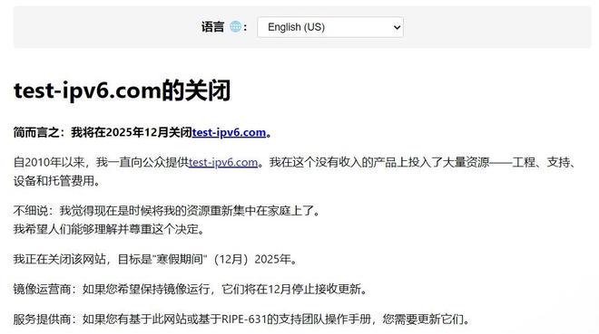 运行15年的IPv6连接测试测试测试-IPV6.com网站将于2025年12月正式关闭。网站创始人Jason Fesler表示,自2010年以来,他已经在网站上投资了许多资源,包括工程,支持,设备和托管费用,但该网站没有收入。他希望能够重新关注家庭资源,并希望人们理解和尊重决定。费斯勒(Fesler)担心域名是否会被转移。替代者应该在世界范围内运作良好。他没有时间评估收件人的技术能力。他以后不能提供支持。他不希望域名通过使用不良的广告或恶意软件来妥协。此外,他没有收到广告,因为“世界上有足够的广告,而HII无法忍受。”捐款不被接受,因为它们不符合工作合同。
